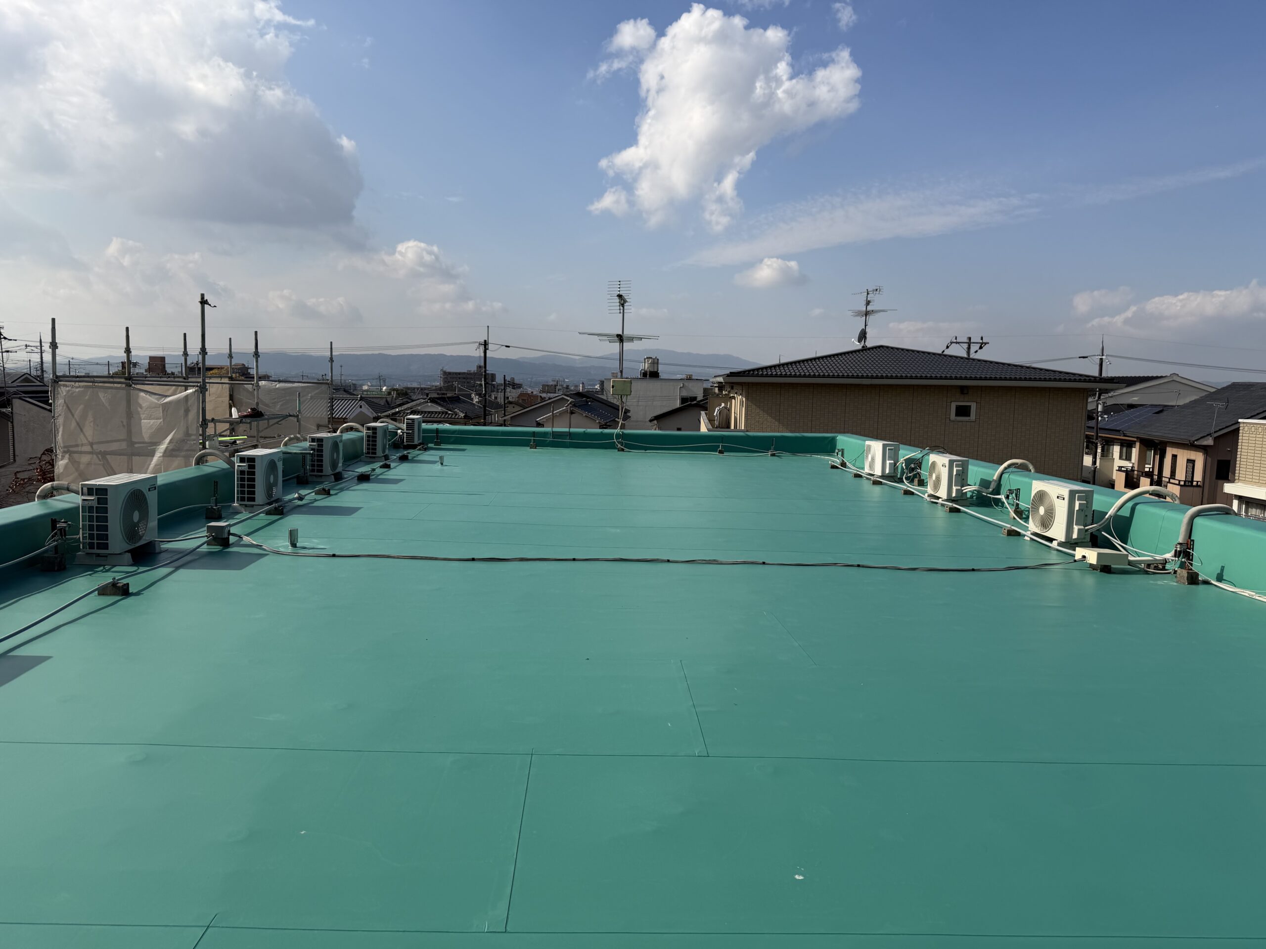 ホテル寮 屋上防水工事 HOME ブログ 屋上防水 ホテル寮 屋上防水工事 Post 施工前の写真:Before 今回の工事はホテル従業員寮の屋上防水工事になります。 施工後の写真:After 今回はグリーンの塩ビシートを使っています。 物件名 ホテル寮屋上防水改修工事 建物種別 寮 場所 奈良県○○市 工期 1週間 工事仕様・内容 <防水工事>・ケレン・清掃・下地絶縁シート、鋼板、ディスク盤取付・シート敷き込み・溶着・シーリング 集合住宅:屋上防水工事 集合住宅:屋上防水工事